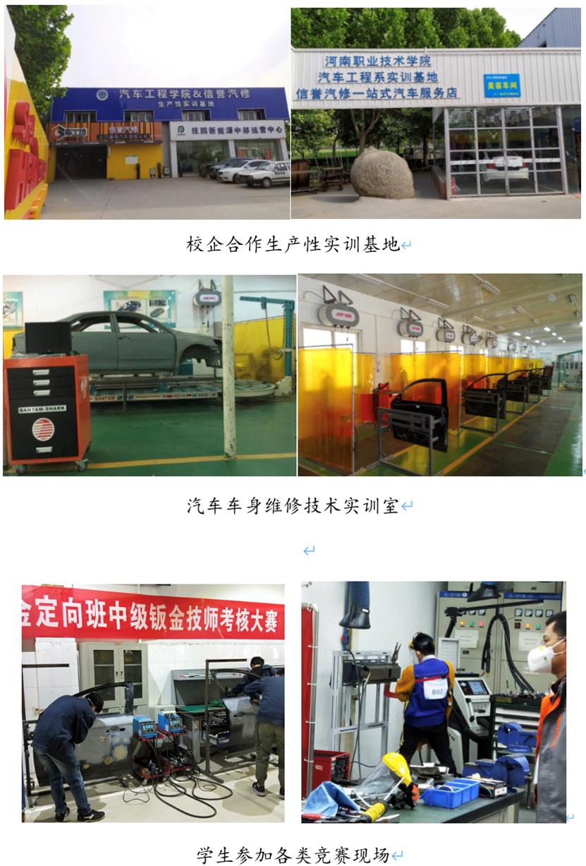 根据专业的发展目标及教学需要,以“双师型”专业教学团队建设为重点,构建专兼结合、结构合理、校企互通、团结合作的专业教学团队。本专业共有专兼职教师6人,其中,具有硕士研究生学历5人,高级技师3人,教授1人,副教授1人,行业企业专家1人。其中2名教师获得上汽通用校企合作团队认证,1人通过北京汽车校企合作团队认证,2名教师获得福特钣金技术团队认证,3名教师通过烟台奔腾钣金技术培训。近五年来,车身专业教师团队主持省级、厅级科研项目10余项,成果丰硕,其中《汽车整形技术》获得河南省首届教材建设奖一等奖,建设院级在线开放课《汽车装饰与美容》和《汽车涂装技术》,参与建设省级在线开放课《汽车维护与保养》,建设院级云教材《汽车整形技术》,指导员工参加机械行业、世界技能大赛并获得奖项4项,参加河南省教学能力大赛并获得一等奖,指导员工获得“互联网+”河南省选拔赛一等奖。