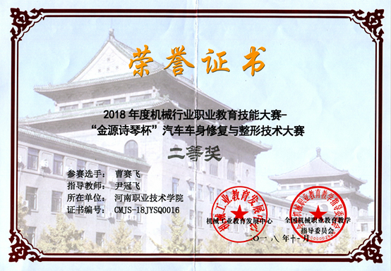 2018年车身专业员工获得机械行业职业教育技能大赛“金源诗琴杯”汽车车身修复与整形技术赛项二等奖 ;