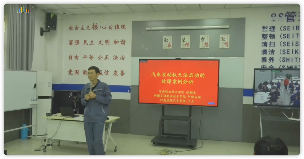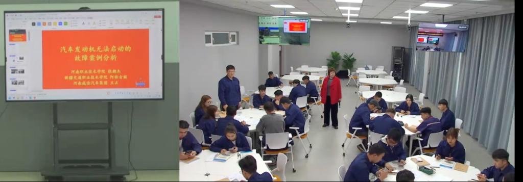 课堂上,张老师带领同学们,首先对汽车发动机无法启动的故障案例进行理论分析相隔千里的两校员工实时交流、积极互动,课堂气氛融洽。随后,王总监将企业生产过程中遇到的汽车发动机无法启动的具体案例引入课堂,以其专业、高超的技能赢得了同学们的一致好评,使产教融合落实到课堂中。阿依古丽老师则带领两地员工,结合不同车型和手册,引导员工进行深入思考,有效推动员工可持续发展能力。