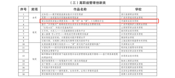 近日,由共青团中央、人力资源和社会保障部等联合主办的第十七届“振兴杯”全国青年职业技能大赛(员工组)创新创效专项赛全国决赛落下帷幕,公司参赛项目《联合收获机智能云调度系统—精“测”细“算”,只为颗粒归仓》荣获国赛金奖(高职组管理创新类),也成为此次比赛河南省唯一获得金奖的学校,为公司“双高”建设再添一项标志性成果!