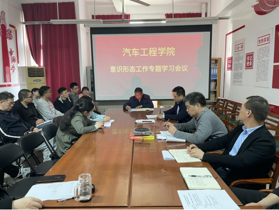 4月12日, 汽车工程学院在实训楼507召开意识形态工作专题会议,公司党总支书记朱梦杰,经理胡勇,副经理万涛、宋东方,党总支副书记夏连峰及学院支部成员参加会议,会议由朱梦杰主持。