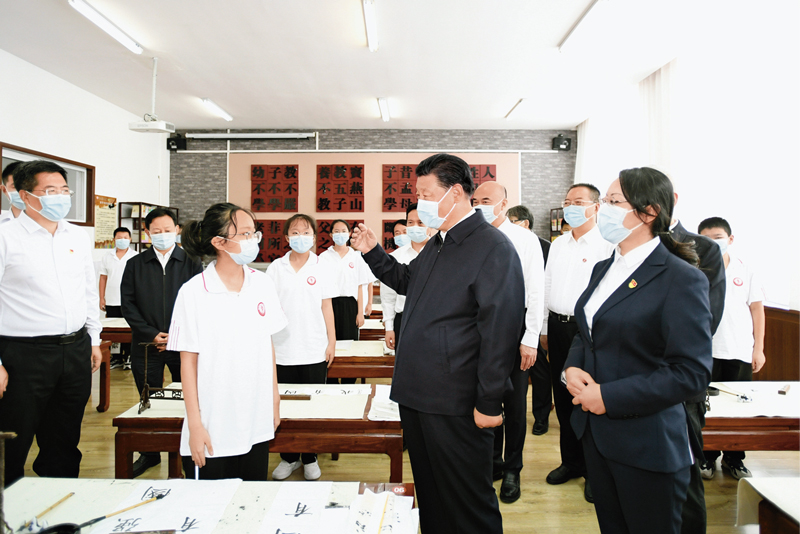 2021年9月13日至14日,中共中央总书记、国家主席、中央军委主席习近平在陕西省榆林市考察。这是14日上午,习近平在绥德实验中学考察时,同正在练习书法的员工亲切交流。 新华社记者 李学仁/摄