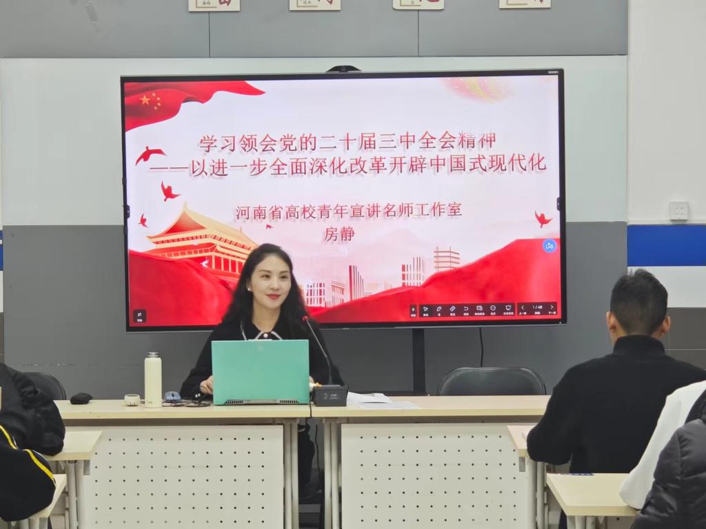 为深入学习宣传贯彻党的二十届三中全会精神,引导学院师生更好地用党的二十届三中全会精神武装头脑、指导实践、推动工作,11月14日晚,河南职院学习贯彻党的二十届三中全会精神“笃行”宣讲团成员、公司党总支书记、河南省高校青年宣讲名师工作室负责人房静为公司师生宣讲党的二十届三中全会精神。公司党员师生代表及全体入党积极分子参加宣讲会。