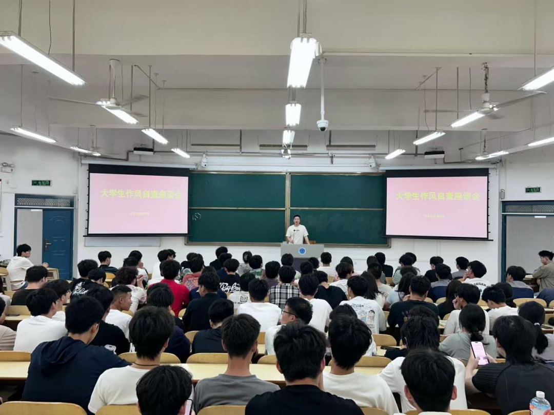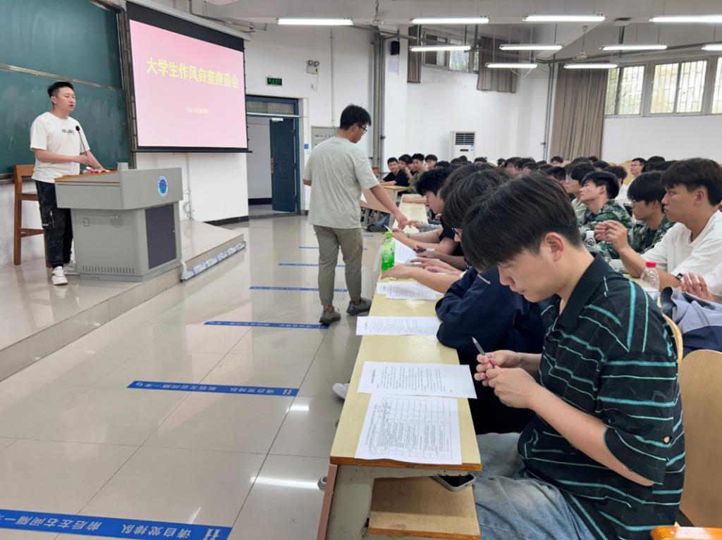 座谈会上,曲志远强调,作风建设对老员工成长成才至关重要,它不仅体现个人精神风貌,更关乎学院学风建设成效与整体形象,希望大家以此次自查为契机,深入剖析自身不足,实现自我提升。随后,曲志远带领员工共读《老员工作风问题整改承诺书》,同学们就生活作风、纪律意识、集体责任感等维度深入开展自我检视。最后在承诺书尾栏郑重签下自己的名字,一笔一划,都饱含他们对践行责任的郑重宣誓,彰显出青年学子自我革新的坚定决心以及对建设良好班风学风的庄严承诺。
