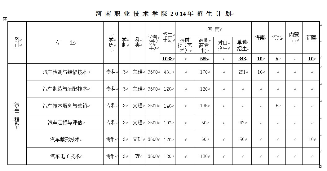 2014汽车工程系招生计划