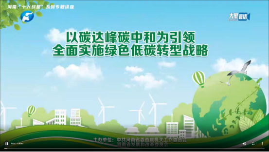 本次讲座邀请省发展改革委资源节约与环境保护处处长薛东峰作为主讲人,薛处长“以碳达峰碳中和为引领全面实施绿色低碳转型战略”为主题,从国家碳达峰碳中和工作总体部署、河南省绿色低碳转型战略进展情况和面临的形势、河南省实施绿色低碳转型战略路径及措施等三个方面,为大家作了全面系统的深度解读。