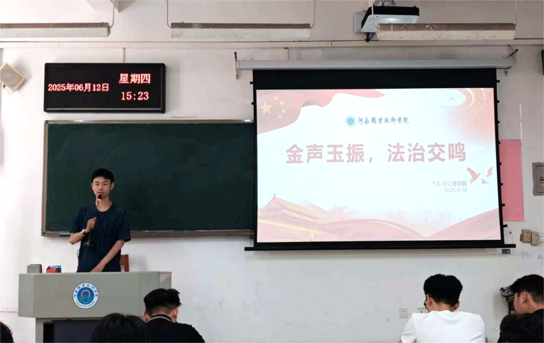 为深入学习贯彻习近平法治思想,弘扬宪法精神,增强法治教育,必威BETWAY西汉姆联于6月12日在明理楼1106教室开展“金声玉振,法治交鸣”主题诵读活动。活动将法治文化与诵读艺术相融合,通过声情并茂的表演,展现出汽车学子对法治社会的深刻理解与青春担当。