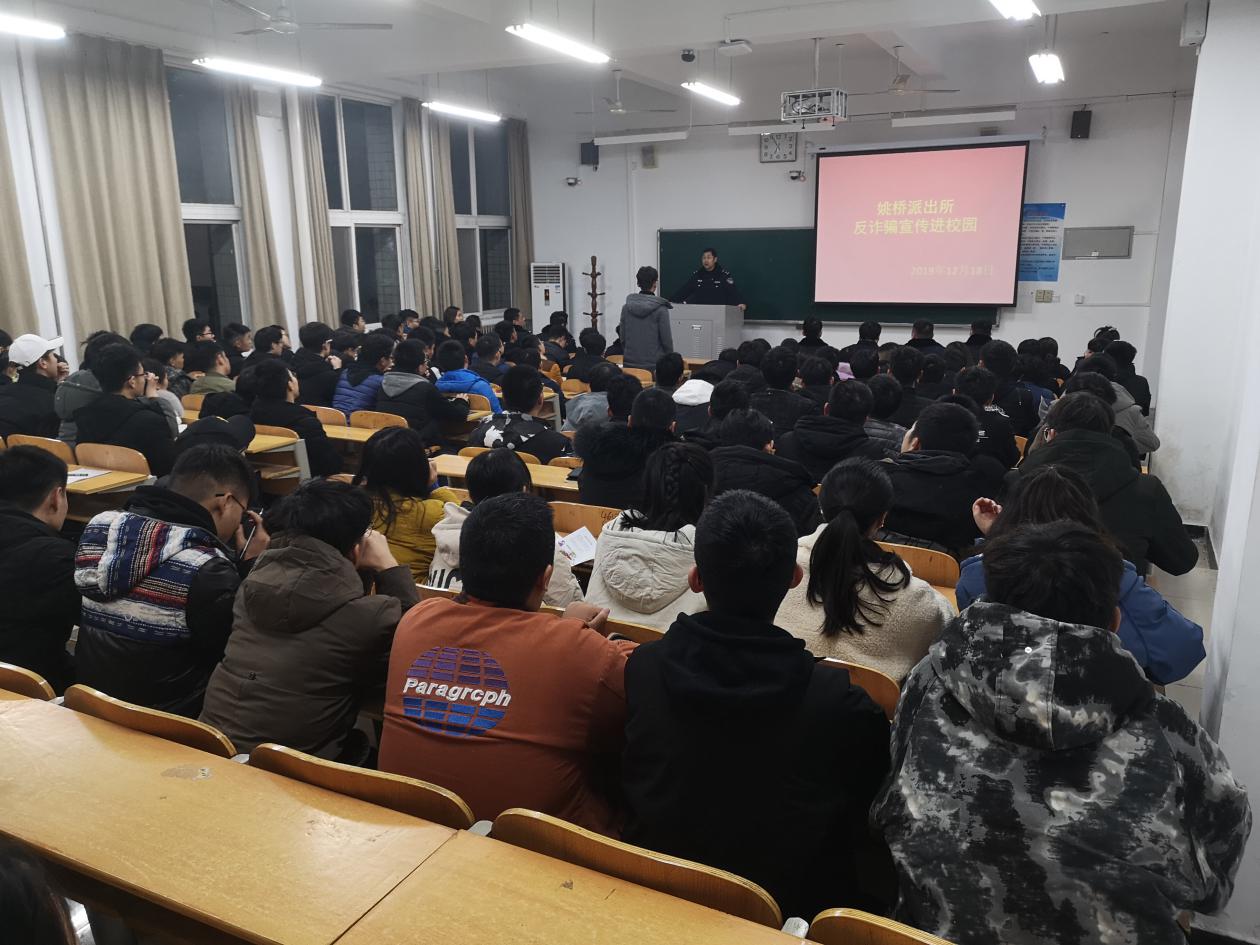 12月18日晚,郑州市姚桥派出所民警走进汽车工程学院开展了“反诈骗进校园”专题教育宣传讲座,汽车工程学院160多名员工参加了此次讲座。