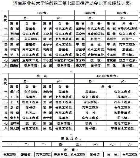 bw必威西汉姆联官网教职工第七届田径运动会比赛成绩统计表