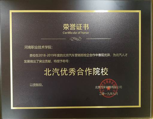 在本次校企合作研讨会中,对在2018-2019年度表现优异、为北汽人才发展做出了突出贡献的院校和个人予以表彰,公司获得“北汽优秀合作院校”和北汽订单班的教师姬虹获得“北汽营销班优秀项目教师”称号。