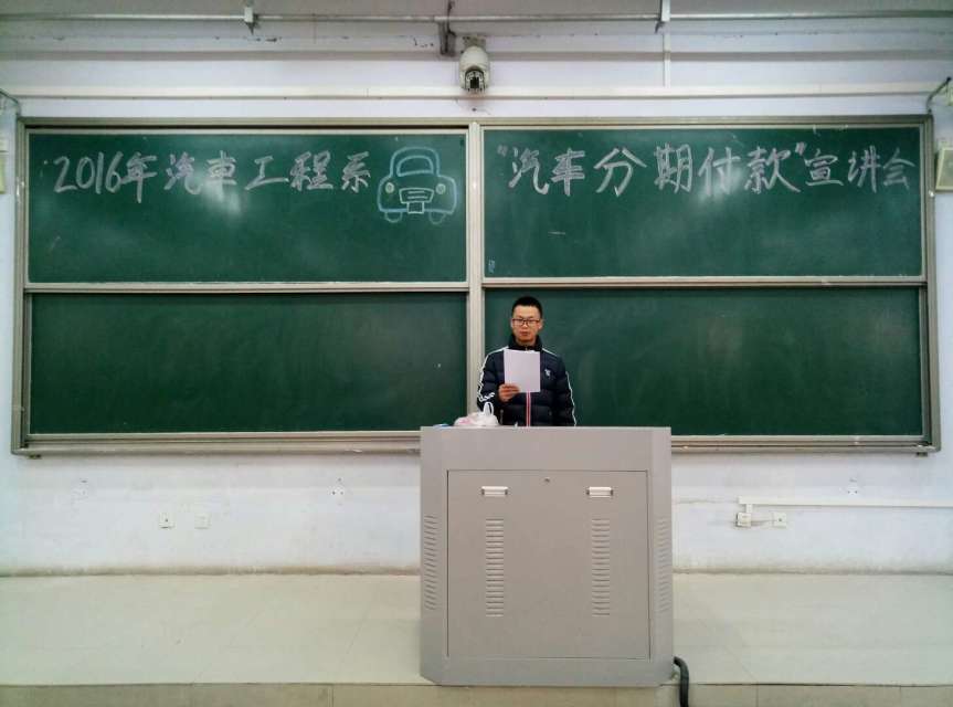10月25日,在1401教室举行了“汽车分期付款”宣讲会,14级汽车检测与维修专业毕业生魏俊进行宣讲,其主要内容是,介绍了汽车分期付款是被忽视的汽车贬值,被忽视的通货膨胀,预期收益率更高,汽车贷款是获取资金成本最低,是手续最方便的方式等优势;市场方面也介绍了银行消费贷款,汽车厂家金融公司贷款,融资租赁,等几种常见的分期付款购车方式的购车趋势;还为大家普及了分期付款购车需要的身份证,房产证或其他有效居留证件原件并提供其复印件;职业和经济收入证明,与经销商签订的购车协议、合同或者购车意向书等相关证件及 银行要求的其他资料等;补充了信用卡分期付款买车,银行分期付款买车,汽车金融公司分期付款买车,担保公司、金融公司分期付款买车等四种常见分期付款购车方式;还提醒了大家一些有关分期付款购车常识。