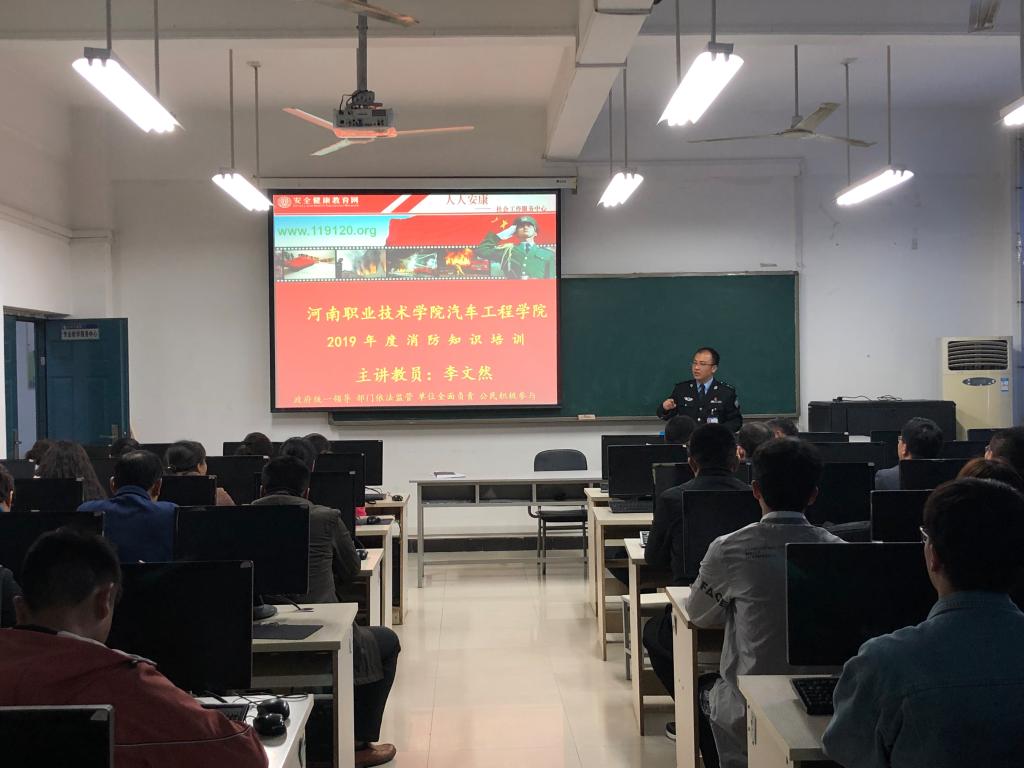 为提高学院师生的安全意识,掌握消防基本知识,11日下午,汽车工程学院在实训楼301教室开展了2019年春季安全检查动员会议及消防安全知识培训活动。公司党总支书记朱梦杰主持本次安全检查动员会议,对学院本次春季安全检查活动进行了部署,要求公司所有教职员工及员工从思想上高度重视,从源头消灭安全隐患,认真贯彻落实“安全第一,预防为主”的安全方针。本次活动邀请河南省消防协会李文然教员来公司授课。李教员通过一个个真实生动的火灾案例,深入浅出的讲述了消防安全的重要性,就防火、灭火、逃生、自救四个方面进行了重点阐述,并介绍了火灾的形成过程、火场中易出现的延误逃生时机的误区、自救逃生的方法以及灭火器的种类、操作使用方法等一系列消防安全知识。本次讲座使公司员工的消防知识和自防自救能力得到了极大提高,对做好消防安全工作的重要性和意义有了进一步认识。公司部分教师及2018级各班生活委员同学共计50余人参加了本次培训活动。(撰稿:张洁,审稿:夏连峰)