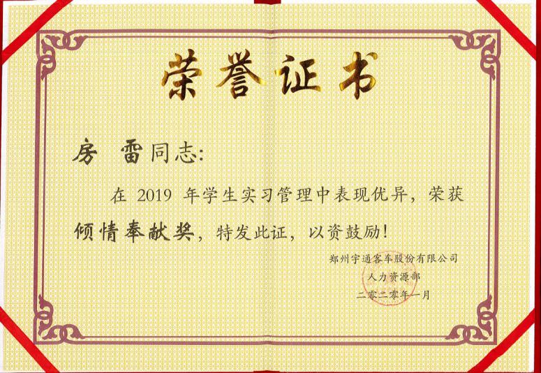 公司房雷教师被郑州宇通客车股份有限公司授予“倾情奉献奖”荣誉称号