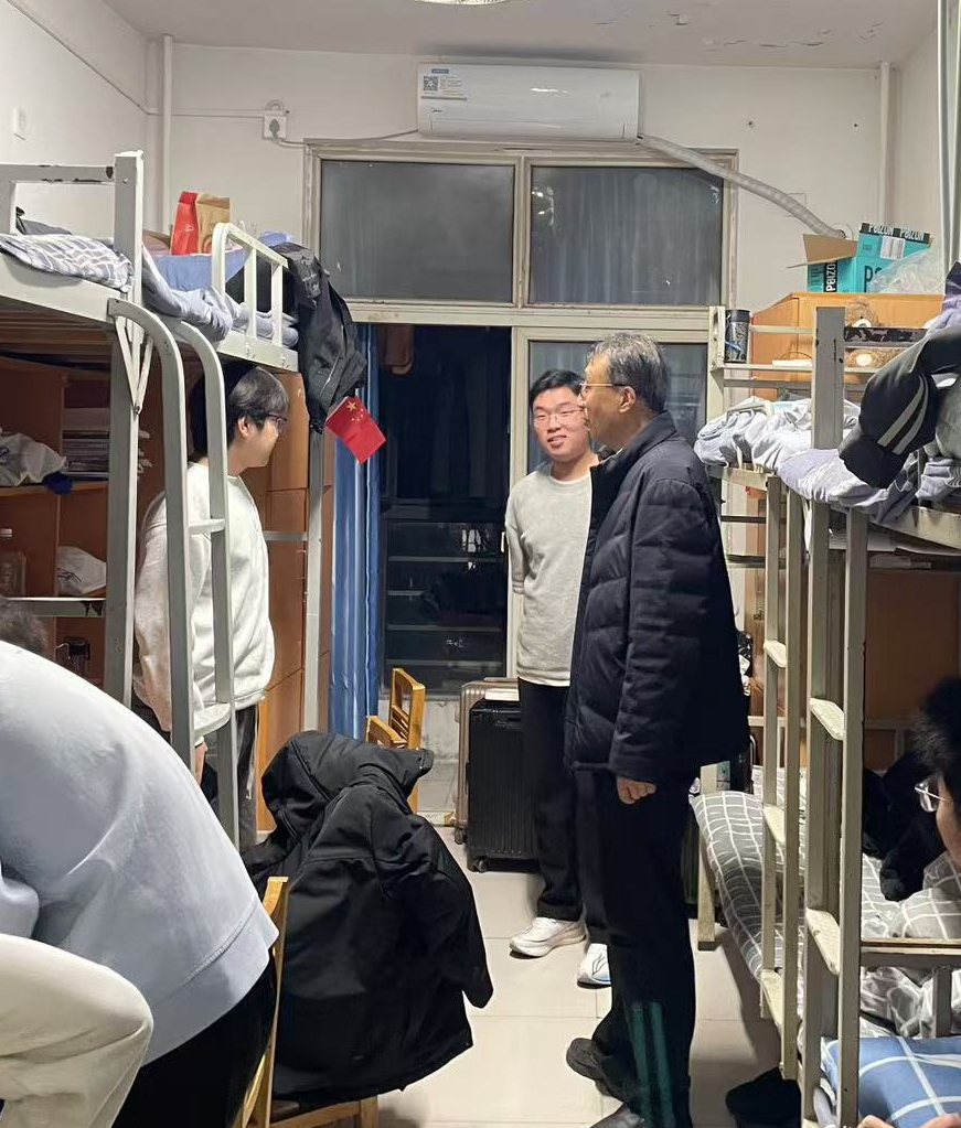 12月25日晚上,吉武俊深入员工宿舍,逐一查看宿舍环境,细致入微地了解员工的生活点滴。每到一处,他都与员工们亲切交流,关心他们能否适应集体生活,耐心询问是否遇到棘手难题。“大家生活上都还习惯吗?要是有难处,一定要跟学校讲。”一句句贴心的问候,瞬间拉近了师生距离。同时,他反复叮嘱员工们务必将宿舍安全牢记心间,倡导同学们培养良好生活习惯,早睡早起、整理内务,携手打造积极向上的宿舍文化氛围。