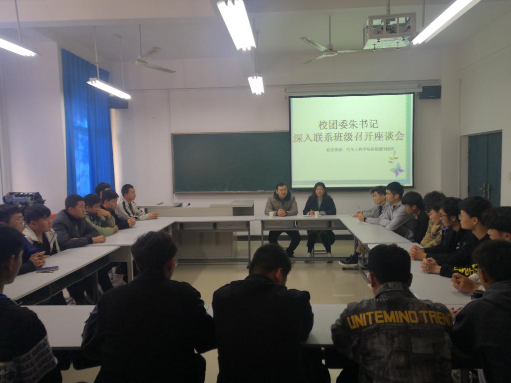 11月21日下午,校团委朱永宽书记到公司实训楼204深入联系班级新能源192班召开座谈会,辅导员王爱巧和该班43名同学参加了座谈会。