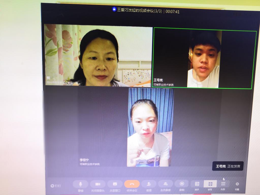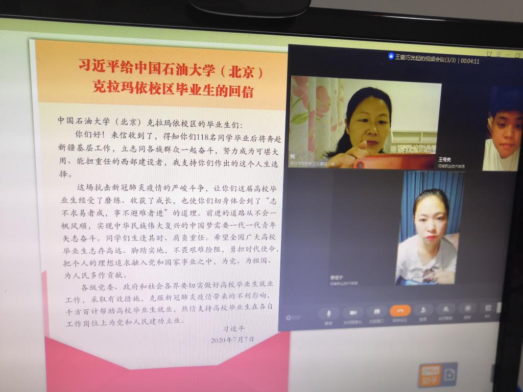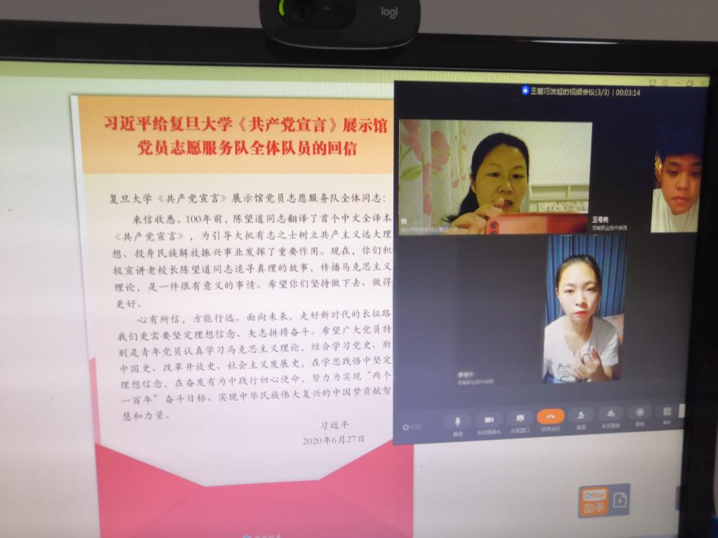 8月23日晚上,汽车工程学院辅导员王爱巧通过钉钉视频会议召开社会实践主题团日活动,“用教育托起明天的太阳”暑期教育社会实践队的2名员工李佳宁、王号亮同学按时参加。王老师首先带领同学们学习习近平总书记五四寄语、给北京大学援鄂医疗队全体“90后”党员回信、给复旦大学《共产党宣言》展示馆党员志愿服务队全体队员回信、给中国石油大学(北京)克拉玛依校区毕业生回信精神、“习近平与老员工朋友们”系列访谈实录等重要内容;然后引导员工根据所学内容,结合暑期社会实践情况,谈谈自己的感悟。2名员工纷纷表示,习总书记的教导恰逢其时,作为新时代的老员工,一定会牢记习总书记的嘱托,认真学习,克服浮躁之气,静下来多读经典,坚持马克思主义理想信念,志存高远,脚踏实地,不畏艰难险阻,勇担时代使命,努力扎根基层,将社会实践常态化,周末、寒暑假会一如既往地到农村为贫困地区的孩子辅导功课,帮助他们提高学习成绩,利用社会这个大课堂历练自我,增长才干,以行动践行使命。