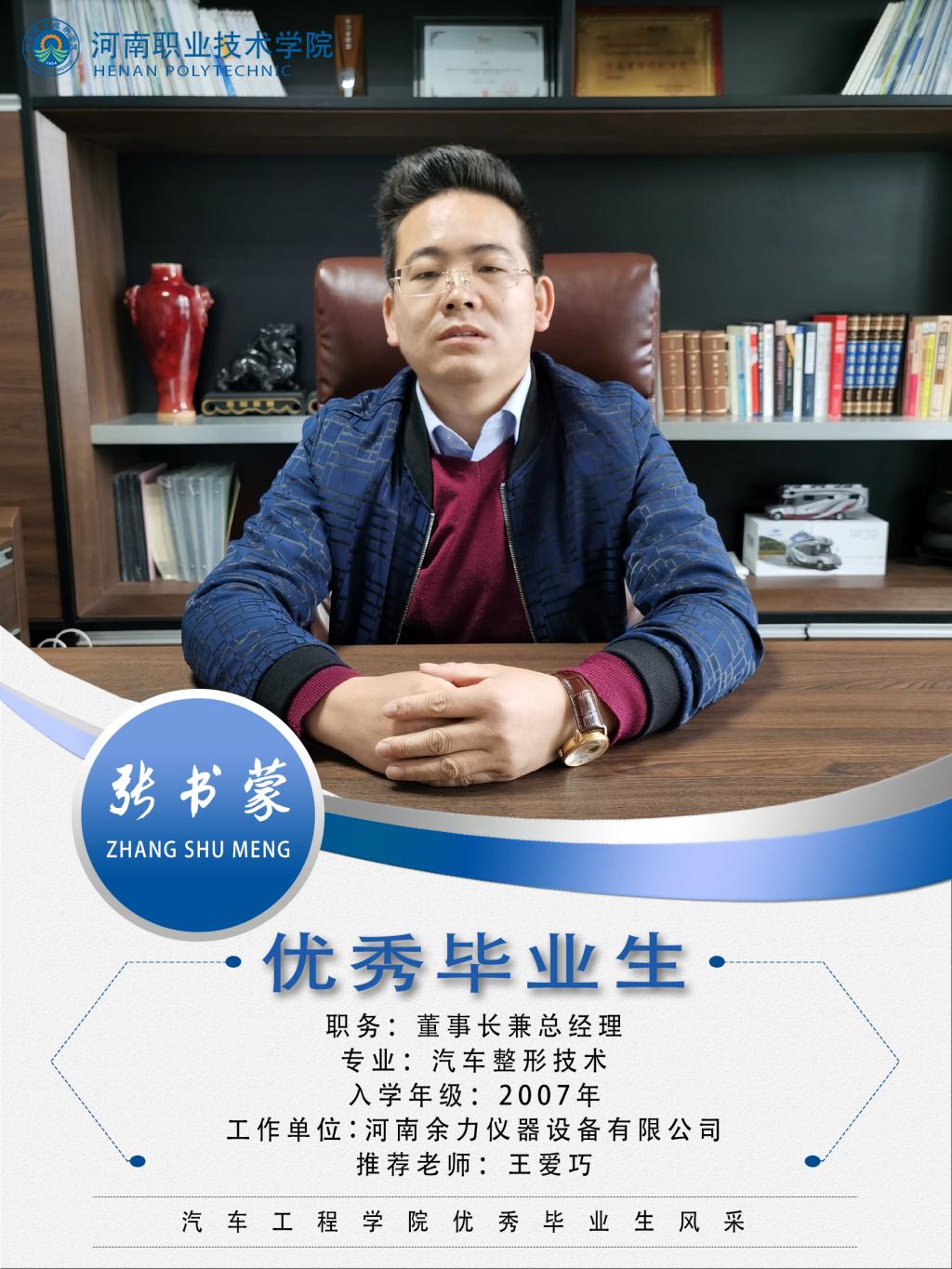 张书蒙,男,汉族,2007年至2010年就读于bw必威西汉姆联官网汽车工程系汽车整形技术专业,曾任系整形071学习委员,在校期间勤奋学习,参加演讲比赛获得学院“一等奖”,积极参加社会实践。获得“三好员工”、“优秀员工干部”、“省级优秀毕业生”等荣誉称号。 毕业后经校园招聘进入郑州宇通客车股份有限公司涂装车间工作,6个月时间实现三级跳。由员工成长为组长、工位长、段长,成为10届入职成长最快的老员工。 2011年8月通过内招应聘进入宇通专用车事业部成为一名普通的业务员。2012年至2018年,先后任宇通专用车事业部东北大区经理、指挥车产品销售经理、军警产品线全国销售经理等职位。先后获得事业部年度优秀新人、优秀师带徒、开拓创业者、劳动模范等荣誉。 2018年11月,经慎重考虑从宇通离职自主创业,创办河南余力仪器设备有限公司,担任董事长兼总经理职务。公司主要从事政府、高校、科研、企业实验室设备的销售与服务工作。作为跨行创业的第一年,2019年实现营收1068万元,基本完成公司年初既定目标。 |