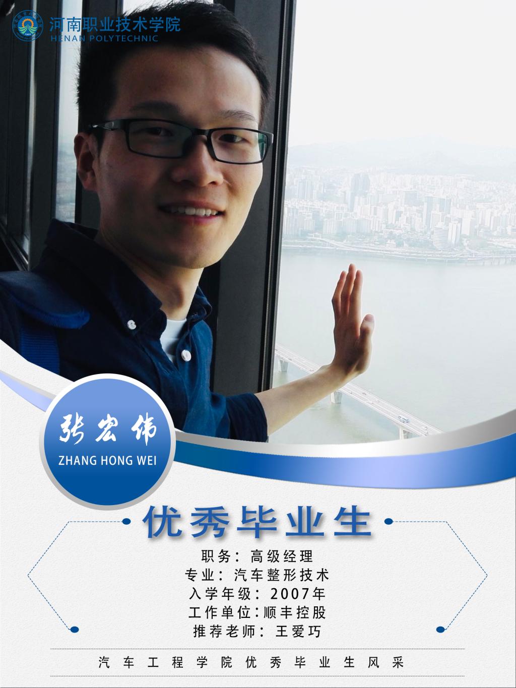张宏伟,男,汉族,2007年至2010年就读于bw必威西汉姆联官网汽车工程系汽车整形技术专业,曾任系整形072班学习委员,在校期间经常参加辩论赛、演讲比赛,学习成绩优秀,利用业余时间参加自考本科,自学日语获得“日语二级”证书,曾荣获“三好员工”、“优秀员工干部”等荣誉称号。毕业后到郑州日产汽车有限公司工作,曾担任物流科课长等职务,2016—2018年在郑州大学完成工商管理硕士研究生学习,2019年到顺风总部担任汽车供应链运营板块负责人。