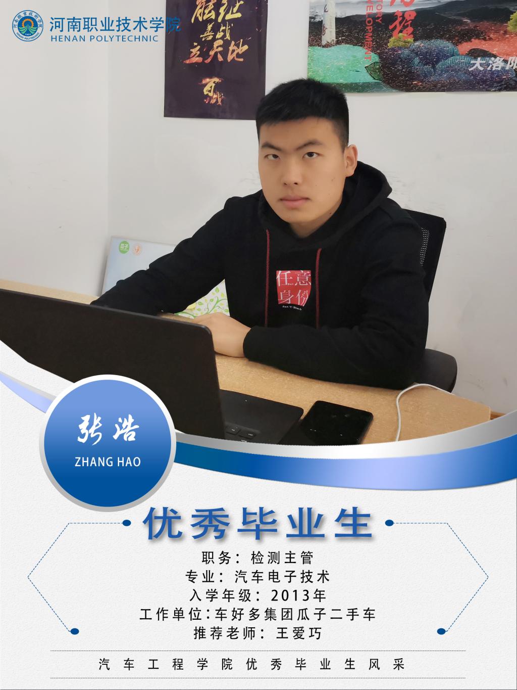 张浩,男,汉族,2013年至2016年就读于bw必威西汉姆联官网汽车工程系汽车电子技术专业,在校期间团结同学,勤奋学习,热爱劳动,获得“优秀团员”等荣誉称号。2018年11月开始负责洛阳新乡二手车检测评估业务,2018年被评为瓜子二手车优秀质量主管、瓜子二手车长空学院优秀学员,2019年被评为车好多大学管理ABC优秀学员。