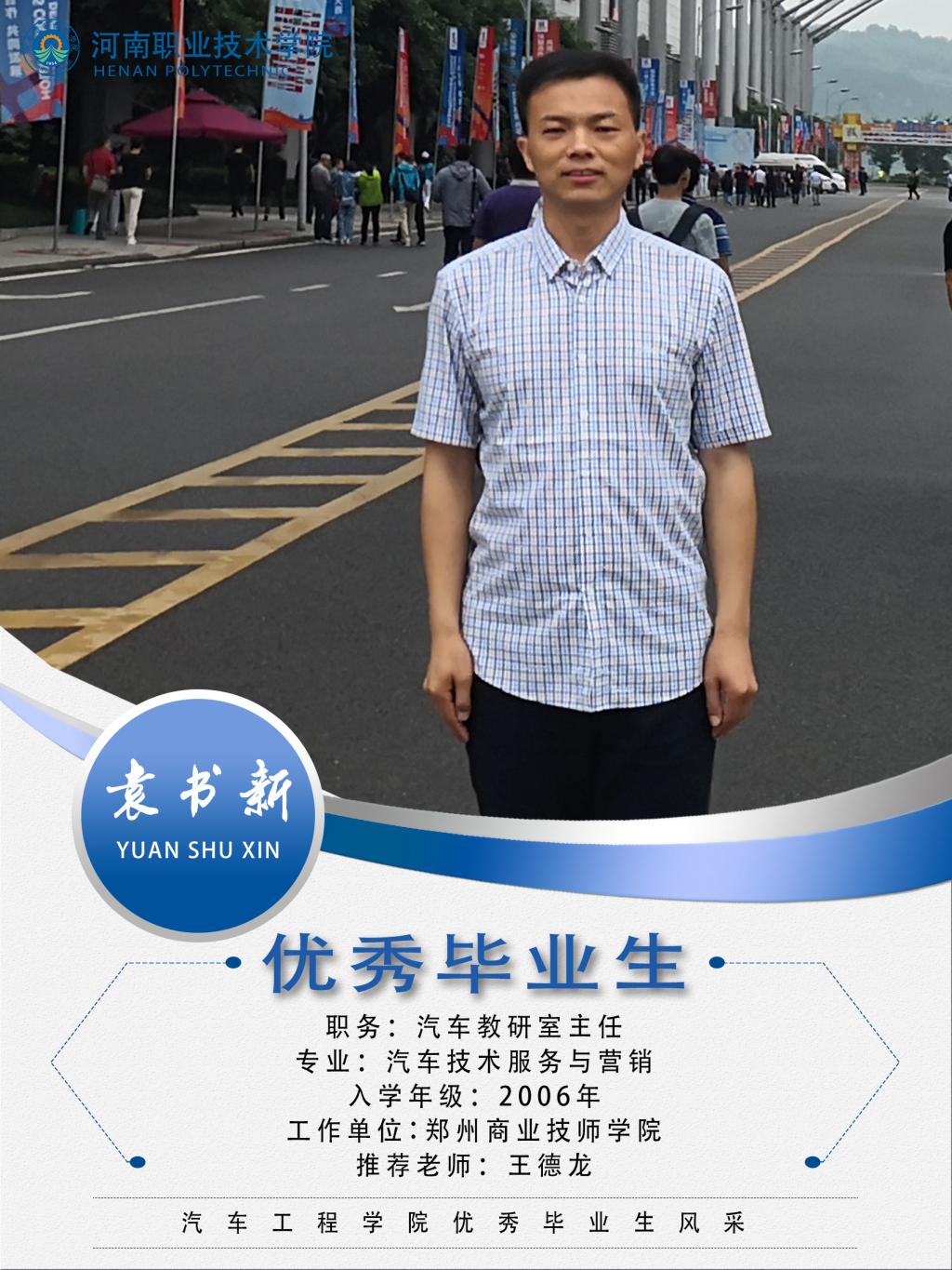 袁书新,男,汉族,2006年至2009年在汽车工程学院汽车营销专业学习。在校期间,积极参加各项集体活动和社会实践活动,曾任班级团支书,院员工会主席,校员工会主席,辅导员助理等职务。2006年至2009年连续三年获得国家励志奖学金、三好员工、优秀员工干部等荣誉,2009年度河南省优秀毕业生。 高级技师,机动车检测工程师、国家级优秀教练、河南省优秀教练、河南省优秀辅导教师、河南省/郑州市职业技能大赛裁判员、全国职业院校技能大赛三等奖、全国汽车职业教育教师技能大赛二等奖,全国交通运输行业技能大赛专家、裁判,全国新能源关键技术大赛裁判等荣誉。此外,编写汽车及新能源汽车教材3本,市级优秀论文一篇,国家级教学成果3项,指导员工荣获国家级大赛一等奖1个、二等奖2个、三等奖1个,省市级大赛10余个。先后荣获多次学院优秀教师、优秀党员、先进工作者、师德标兵、教学能手、所带领的教研室团队荣获学院最美团队、最美商院人等殊荣。 |