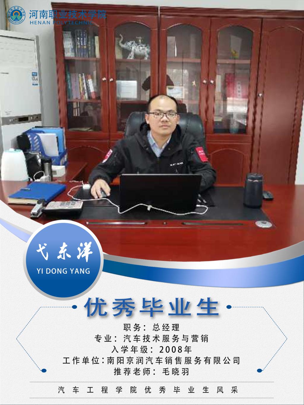 弋东洋,男,汉族,2008年至2011年就读于bw必威西汉姆联官网汽车工程系汽车服务与营销专业,在校期间勤奋学习,毕业后进入河南天道汽车销售服务有限公司,担任展厅经理、销售经理,2017年3月进入南阳京润汽车销售服务有限公司担任总经理,同时担任首约科技(北京)有限公司南阳分公司负责人。北京汽车全国十佳经销商