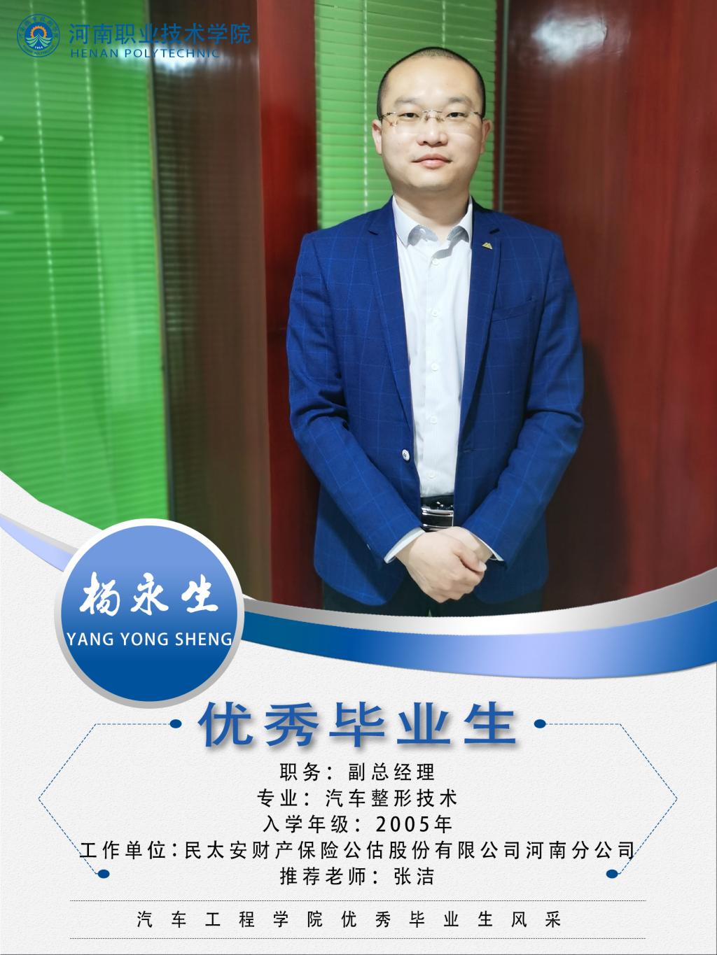杨永生,男,汉族,2005年至2008年就读于bw必威西汉姆联官网汽车工程系汽车整形技术专业,曾任系员工会主席、班长等职务,在校期间勤奋学习,成绩优异曾获国家奖学金、优秀员工干部、三号员工等荣誉称号。2008年毕业后进入民太安财产保险股份有限公司河南分公司工作。荣获民太安集团十年服务奖章,优秀分公司班子成员。