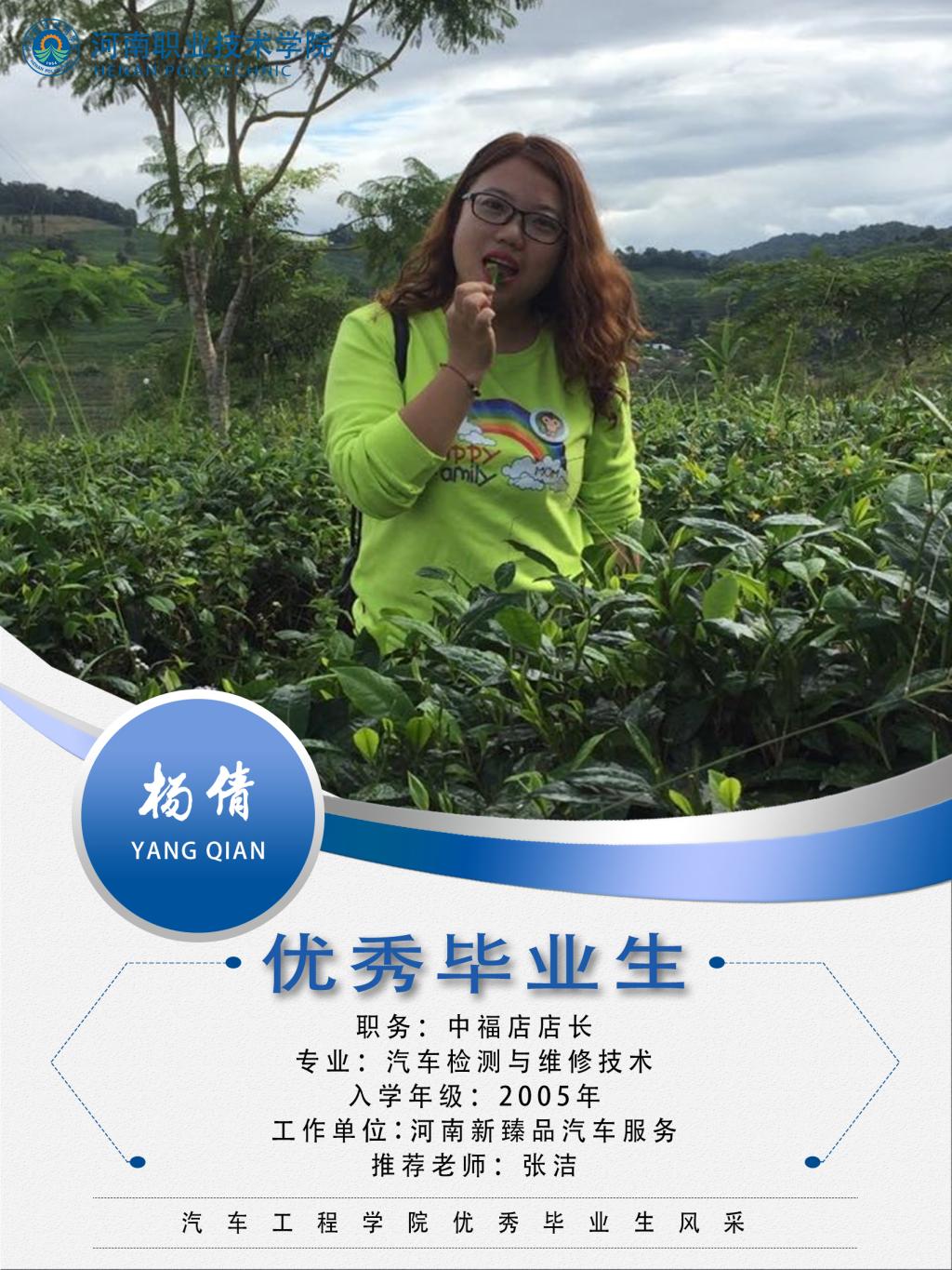 杨倩,女,汉族,2005年至2008年就读于bw必威西汉姆联官网汽车工程系汽车检测与维修技术专业。在校期间担任班级团支书,成绩优异,获得一等奖学金、优秀员工干部等荣誉称号。2007年至2017年在河南成悦汽车销售服务有限公司任客服经理。先后三次参加广汽丰田“尊尚杯”职业能力比赛客户咨询对应比赛,荣获区域一等奖。2017年至2020年在恒信路伟汽车销售有限公司任客服经理。2020年在河南新臻汽车服务任中福店店长,负责全面工作。