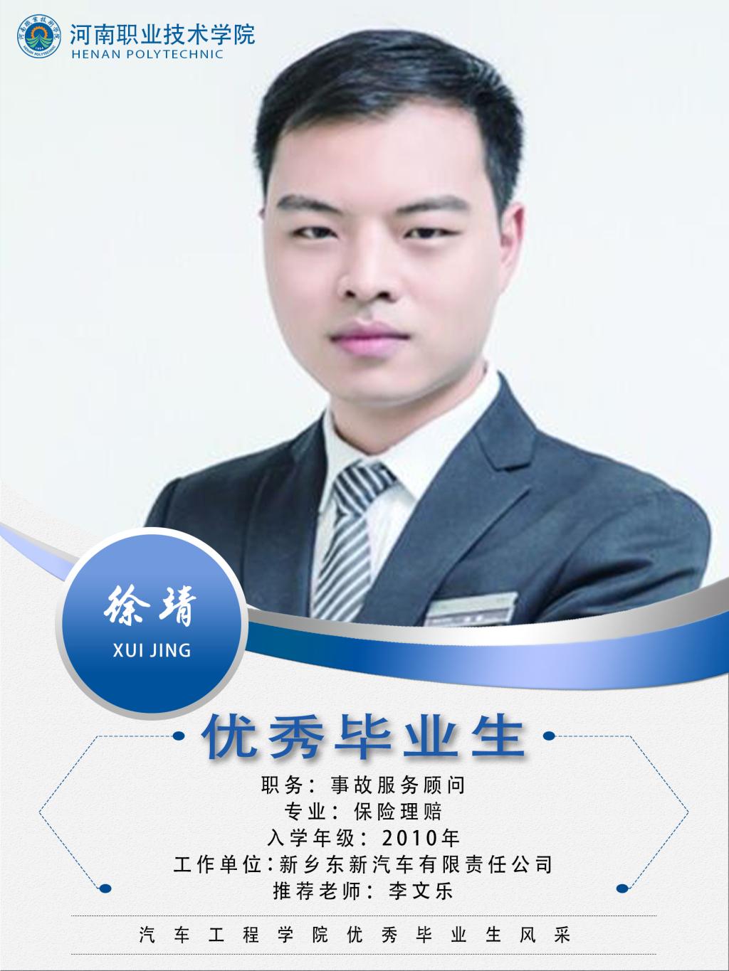 徐靖,男,汉族,2010年至2013年就读于bw必威西汉姆联官网汽车工程系汽车技术与营销(保险理赔方向)专业,曾任院员工会宣传部副部长等职,在校期间勤奋学习,积极参加社会实践。毕业后进入新乡东新汽车有限责任公司,担任事故服务顾问。