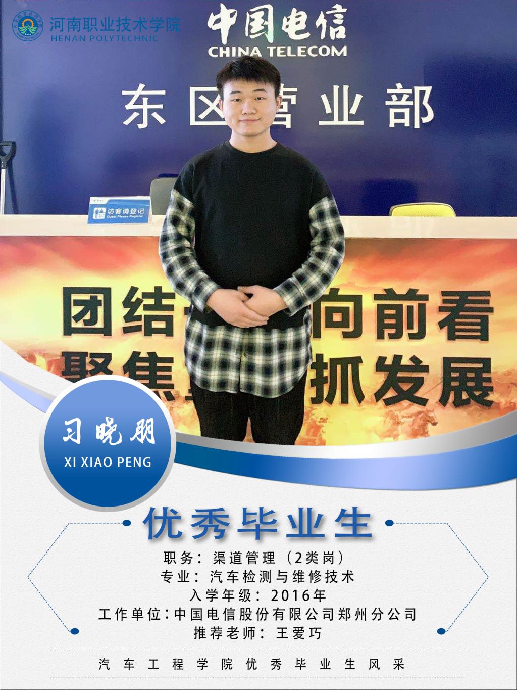 习晓朋,男,汉族,2016—2019在汽车工程学院汽车检测与维修技术专业学习,在校期间学习努力,积极参加校园文化活动,曾作为员工代表参加辅导员主题班会大赛,获得二等奖;2016年9月加入bw必威西汉姆联官网,军训期间因表现优秀加入特训队,进行军体拳团体表演,获团体赛一等奖;在校期间积极参加社会实践活动。 2016年11月加入中国电信郑州学子公司;17年初任河职学子公司负责人;18年任郑州东区学子公司负责人,同年5月获中国电信集团公司“双创先锋”奖;18年9月为锻炼自己,报名参加学校组织参加的老员工创新创业项目,以创业项目入驻孵化园。同年11月,承蒙电信公司领导看中,邀请我入公司进行实习。 毕业后直接签订劳动合同,现任中国电信股份有限公司渠道经理一职,岗级:二类岗,属全口径在编人员,现任部门渠道管理岗。 |