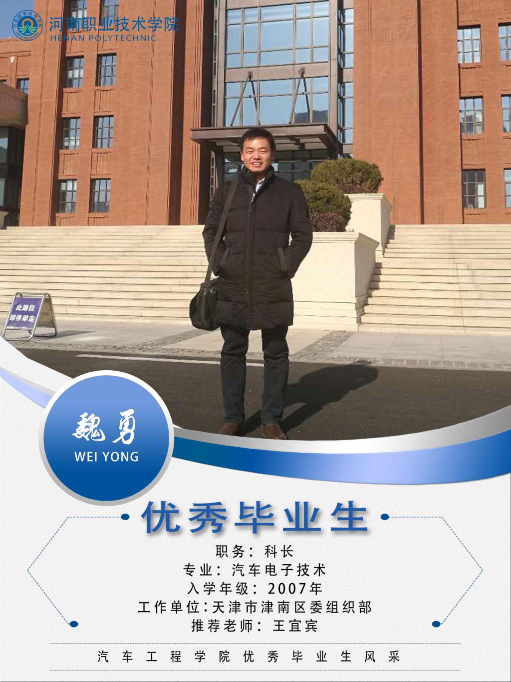 魏勇,男,汉族,2007.9-2010.7在汽车工程学院汽车电子专业学习,在校入党,曾任班长,学校青年志愿大队长,(2008年度国家励志奖学金,2009年度国家励志奖学金,2009年度河南省优秀老员工干部,2010年度河南省优秀毕业生,2010年6月郑州大学行政管理学专业自考本科毕业); 2011.9-2014.7云南民族大学马克思主义民族理论与政策专业硕士研究生(其间:参与国家级课题1项、省部级课题3项,发表学术论文8篇,第七届全国民族理论研究生学术论坛二等奖,2013年度国家奖学金); 2017.11-2019.6天津市津南区八里台镇人民政府科员(其间:2018年6月河南财经政法大学工商企业管理专业自考本科毕业); 2019.6至今天津市津南区委组织部科长(其间:2019年6月河南大学经济学专业自考本科毕业)。 |