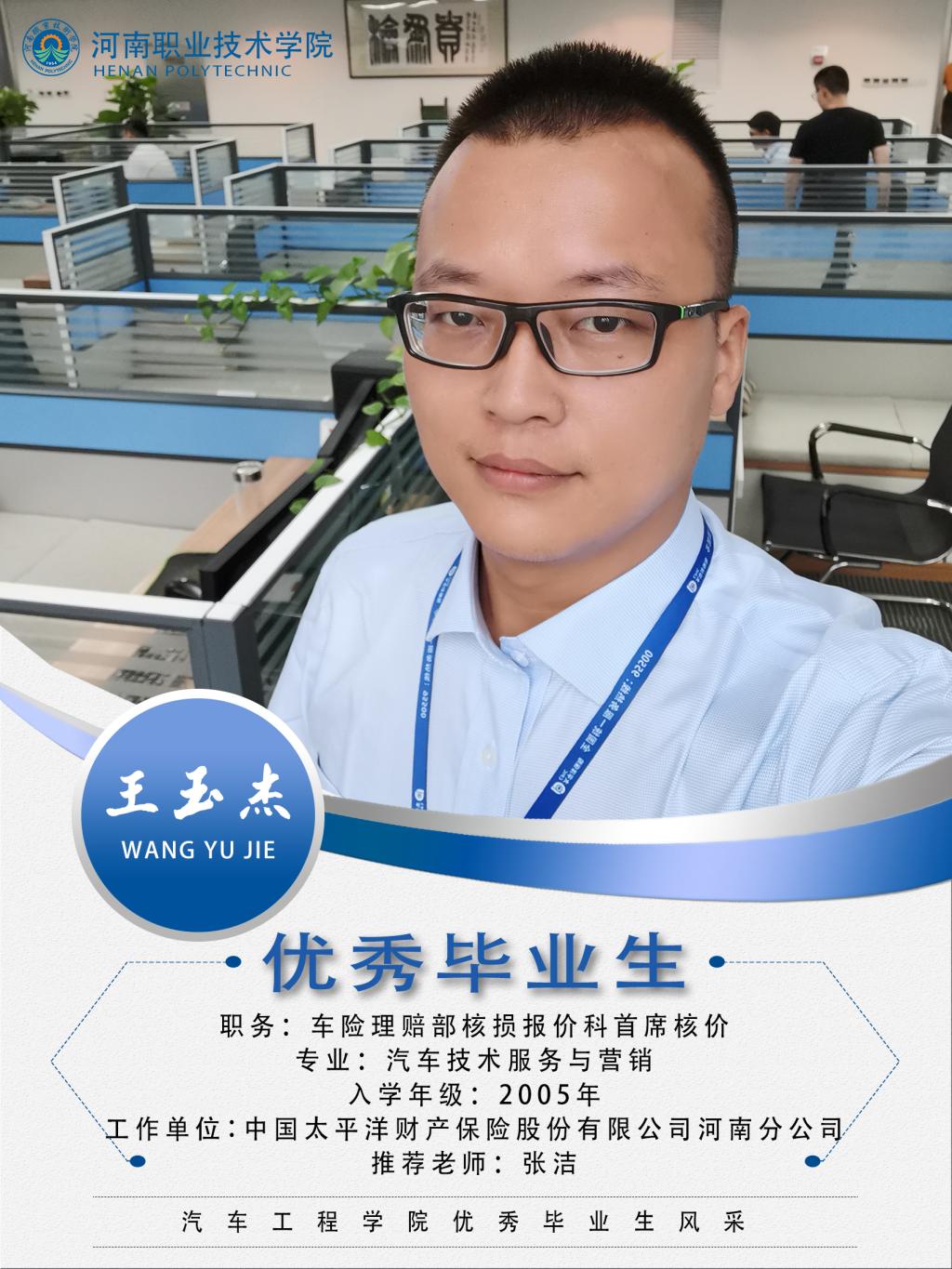 王玉杰,男,汉族,2005年至2008年就读于bw必威西汉姆联官网汽车工程系汽车检测与维修技术专业。在校期间担任系员工会体育部部长职务。毕业后入职深圳民太安保险公估有限公司河南分公司从事车险公估工作。参加过汶川地震灾后重建工作。2008年进入太平洋财险河南分公司。