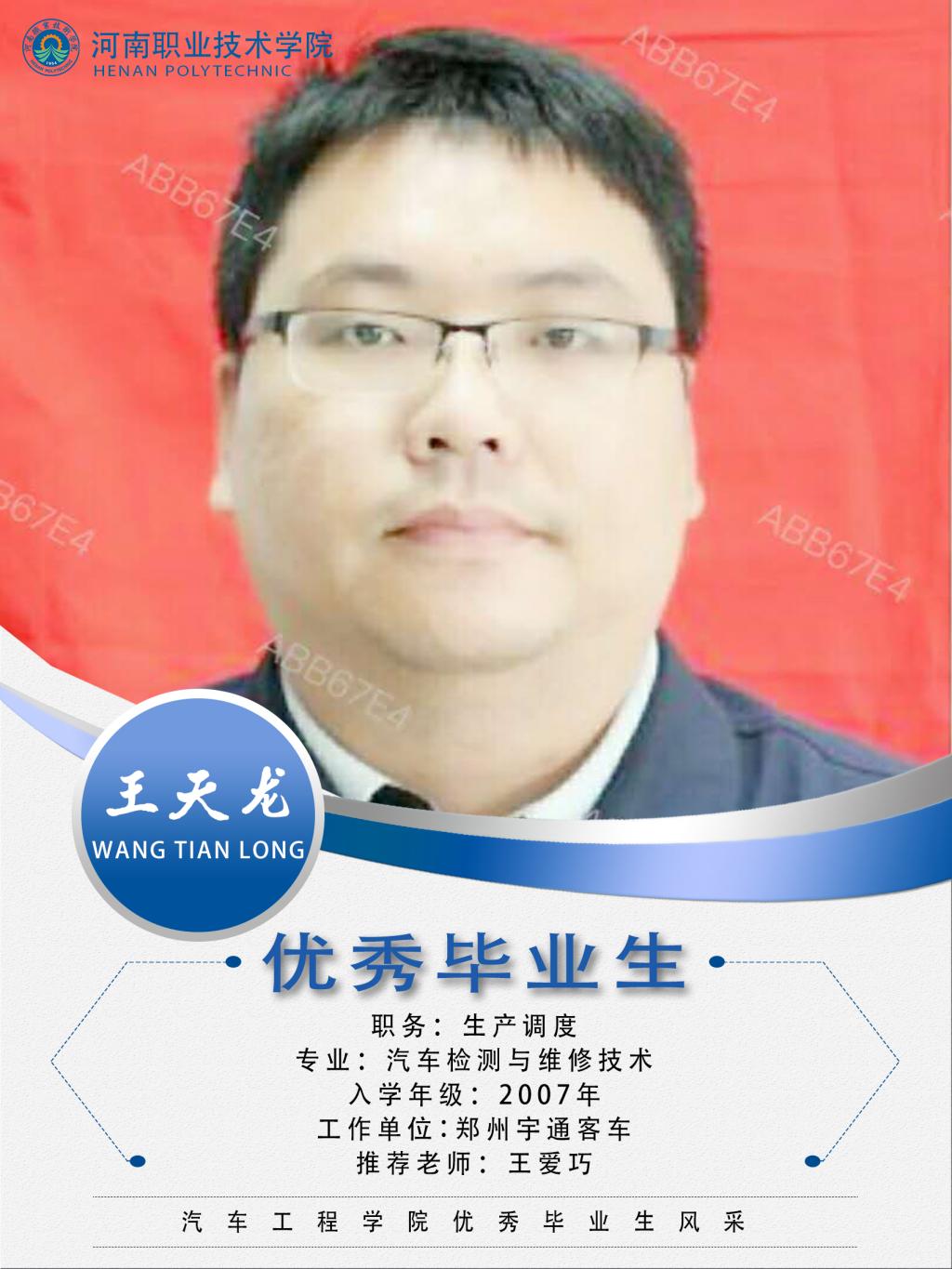 王天龙,男,汉族,2007—2010在汽车工程学院汽车检测与维修技术技术专业学习,曾担任汽修073班班长和员工会主席,在校期间勤奋学习,积极带领员工参加校园文化活动,表现优秀,多次被评为,多次被评为”公司“三好员工”、“优秀团干”、“优秀班干部”、“省级优秀毕业生”等荣誉称号。 毕业后进入郑州宇通客车股份有限公司,2010—2011年生产调度,2011—2013年商务部生产协调专员,2013—2015年西南大区贵州省业务经理,2015—2018年专用车分公司计划主管、分公司生产调度、一线改装生产段长、路试交车生产段长,2018年至今生产处生产调度。 |