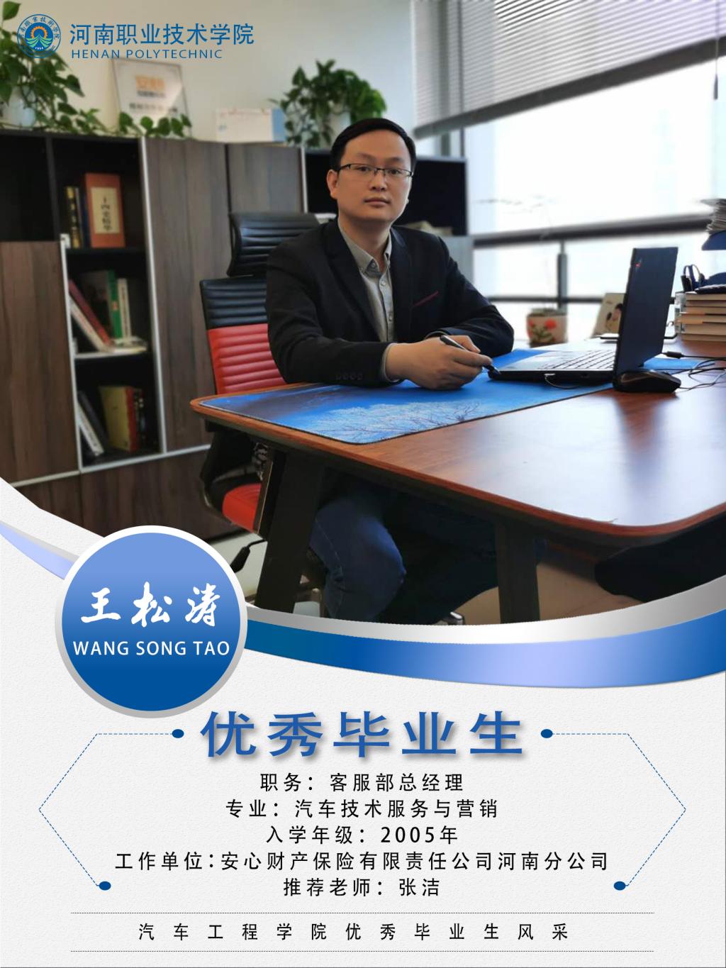 王松涛,男,汉族,2005年至2008年就读于bw必威西汉姆联官网汽车工程系汽车技术服务与营销专业,曾任系员工会宣传部部长、院员工会宣传部部长职务,在校期间勤奋学习,成绩优异曾获励志奖学金、优秀员工干部、三号员工等荣誉称号。毕业后进入安心财产保险有限责任公司河南分公司,荣获全国优秀客户服务中心,总公司先进个人称号。