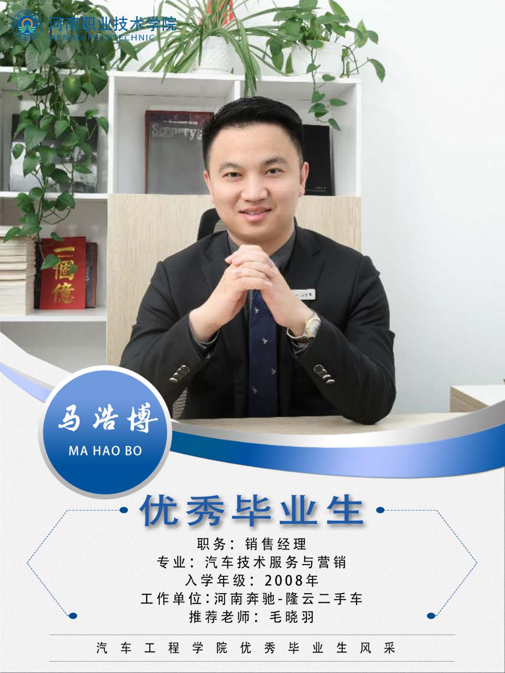 马浩博,男,汉族,2008年至2011年就读于bw必威西汉姆联官网汽车工程系汽车服务与营销专业,在校期间担任班长,勤奋学习,毕业后进入河南裕华奥捷汽车有限公司,担任销售主管,2013年加入郑州利星汽车销售有限公司,2015年担任销售主管,2017年调入河南奔驰隆云二手车负责全省二手车销售,担任销售经理。