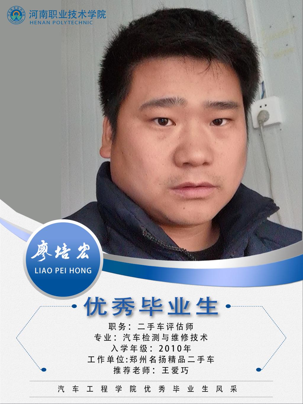 廖培宏,男,汉族,2010—2013在汽车工程学院汽车检测与维修技术技术专业学习,在校期间勤奋学习,积极参加校园文化活动,善于帮助同学,表现优秀。毕业后在汽车行业摸爬滚打了几年,2014年3月和朋友一起创立了郑州名扬精品二手车车行。起初从事评估、收购、销售面包以及5万以下的小型汽车。2016年6月至今开始评估、收购、销售30万元以下任何车型。
