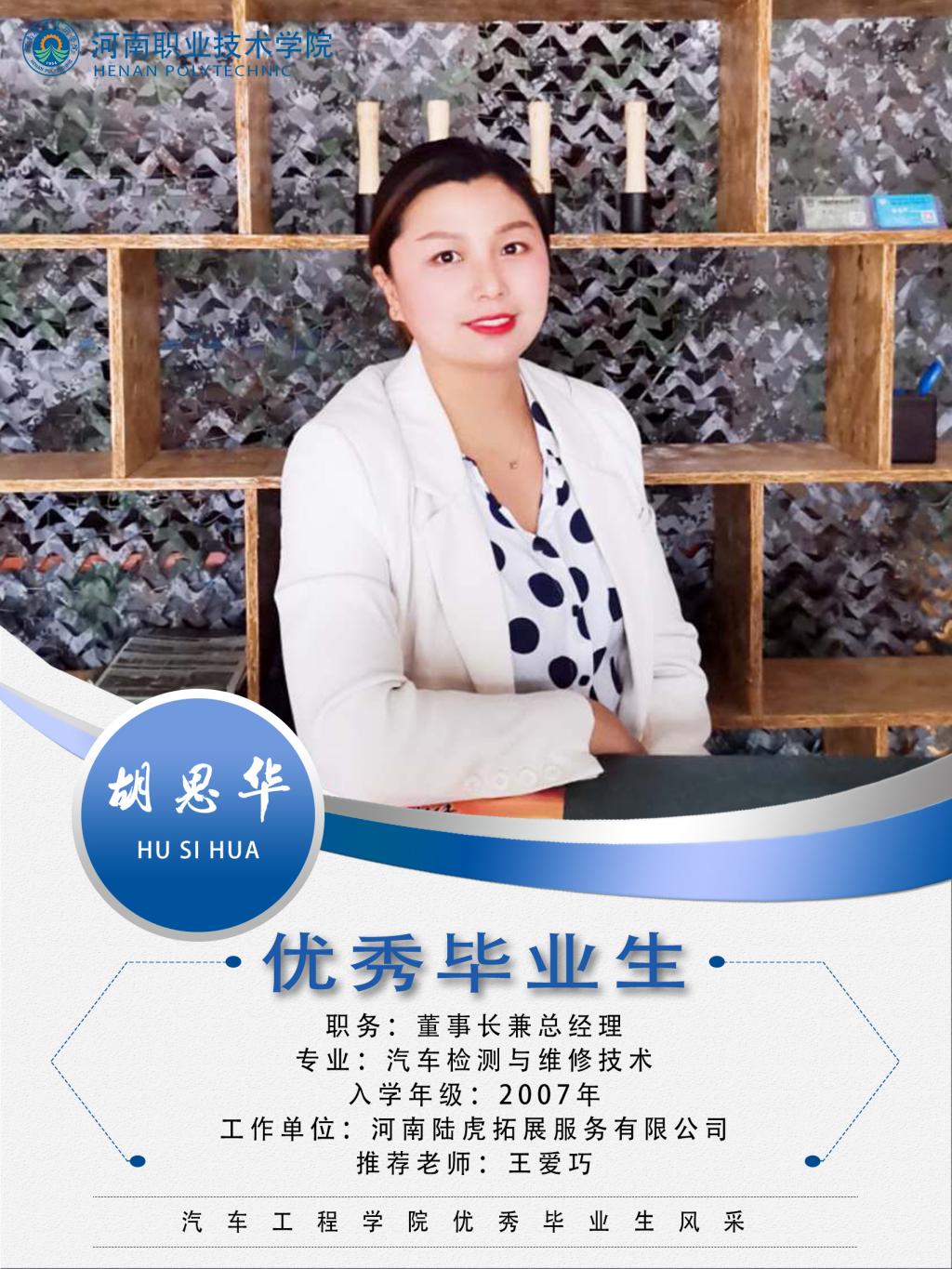胡思华,女,汉族,2007年至2010年就读于bw必威西汉姆联官网汽车工程系汽车检测与维修技术专业,曾担任员工会文艺部副部长,在校期间勤奋学习,积极参加社会实践,荣获“优秀员工干部”、“最佳辩手”等荣誉称号。2010年创建郑州陆虎战友企业管理咨询有限公司,并于2016年更名为“河南陆虎拓展服务有限公司”,并担任董事长,同时担任“荣博斯达青少年编程培训中心”执行董事长。2015年带领的教练团队负责河南省技工院校体育运动会开幕式获得“雄狮劲旅”称号,2019年荣获“优秀党员创业示范基地”称号。
