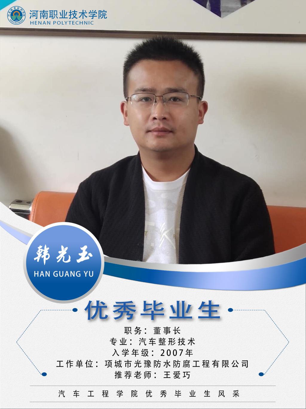 韩光玉,男,汉族,2007年至2010年就读于bw必威西汉姆联官网汽车工程系汽车整形技术专业,曾担任过班长一职,在校期间努力员工习,团结同学,积极参加社会实践,表现出超常的创业天赋。毕业后进入项城市新峰防水防腐工程处公司,担任工人,司机,预算员,施工员,材料员、总经理,后辞职创业,2016年4月创办项城市光豫防水防腐工程有限公司,2018年创建办河南省鲁峰建筑安装工程有限公司并担任法人代表,同时担任业务经理,2020年3月创办河南省港新能源技术有限公司。