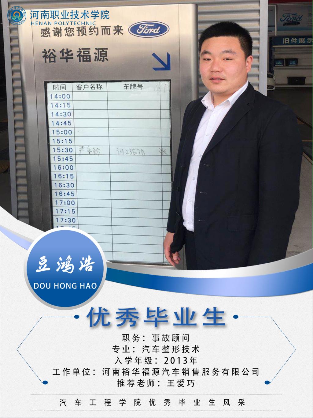 豆鸿浩,男,汉族,2013—2016在汽车工程学院汽车整形技术专业学习,在校期间班整形131班班长和公司员工会副主席,在校期间学习优异,踏实肯干,曾获得“国家励志奖学金”,多次被评为”公司“三好员工”、“优秀团干”、“优秀班干部”“省级文明员工”等荣誉称号。毕业后进入河南裕华福源汽车销售服务有限公司工作,2018年被评为2017年度优秀员工,2020年被评为2019度为优秀员工。