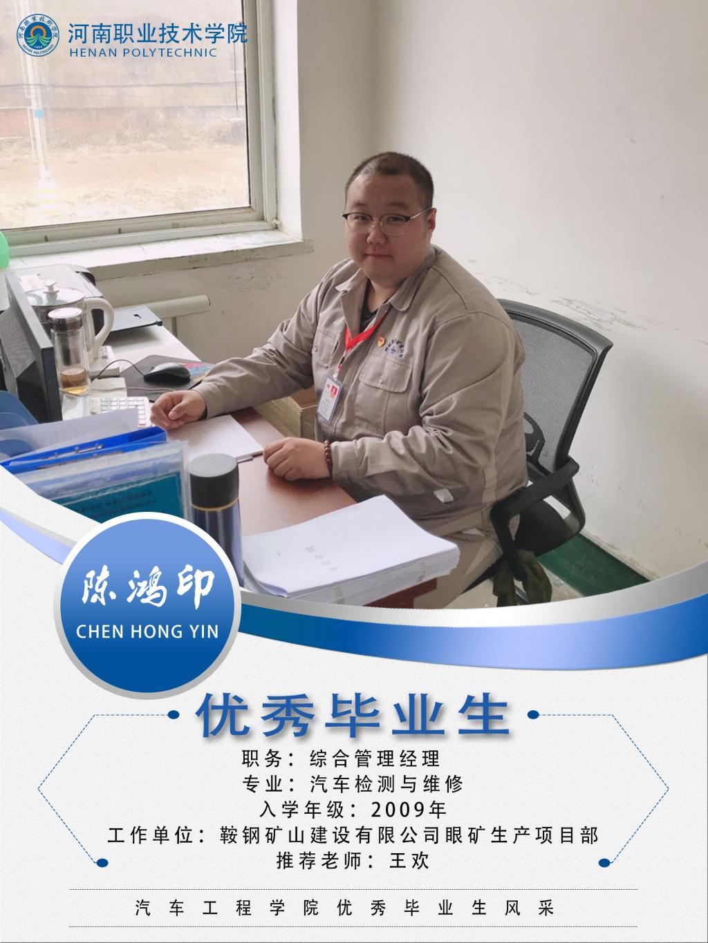 陈鸿印,男,汉族,2009年至2012年就读于bw必威西汉姆联官网汽车工程系汽车检测与维修专业,曾任系员工会副主席,在校期间勤奋学习,积极参加社会实践,带领员工会积极配合员工管理工作,组织大型文艺晚会、员工活动等。在校期间,获得河南省省级三好员工、院优秀班干部、院三好员工、优秀员工会干部等荣誉。 2012年毕业后回到家乡辽宁省鞍山市自主创业,在鞍山红星美凯龙开启油画店,同年拉菲德堡法式家具店开业。2014年泰阳榻榻米家具店在红星美凯龙开业。 2018年进入鞍钢矿山建设有限公司工作,担任综合管理经理一职至今。 人生格言:机会永远留给有准备的人。 |