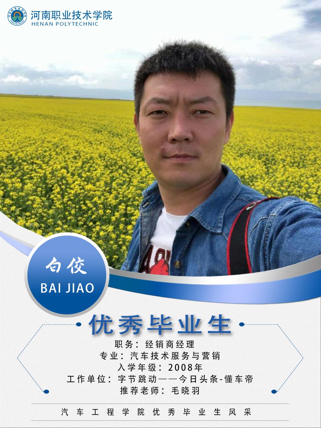 白佼,男,汉族,2008-2011年就读于bw必威西汉姆联官网汽车工程系汽车服务与营销专业,在校期间积极努力,勤奋学习,毕业后进入河南众通汽车销售服务有限公司,担任销售顾问,网络营销经理。2015年进入汽车之家并担任城市经理负责三门峡;焦作等城市。2018年进入今日头条-懂车帝,担任新乡城市经理职务。