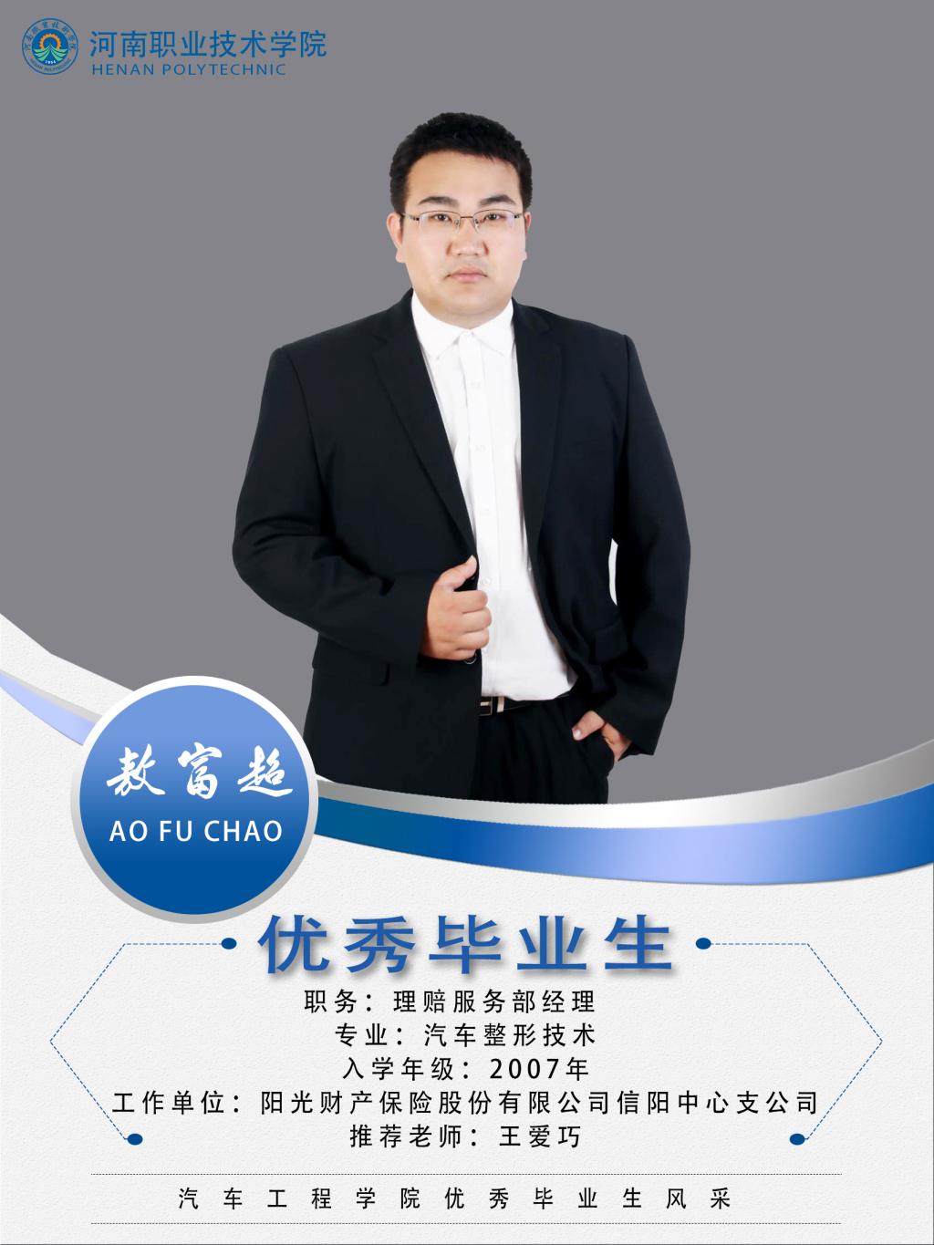 敖富超,男,汉族,2007年至2010年就读于bw必威西汉姆联官网汽车工程系汽车整形技术专业。曾在学校志愿者协会、环保协会等部门任职。在校期间努力学习,积极参与社会实践,表现优秀。毕业后于2010年1月份进入东莞民太安工作。2013年加入河南信阳阳光保险。2017年任职信阳阳光保险理赔部经理一职。2013年度河南省分公司“优秀员工”,2016年获得河南信阳中心支公司“最诚实可靠奖”,2016年信阳保险诚信服务标兵。